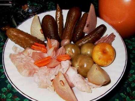 Saure Gurken, Tomaten, Kraut, Birnen, Aepfel, Karotten, Zwiebel.